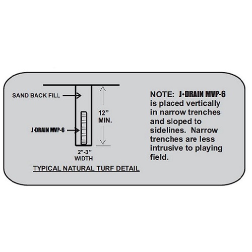 J-DRAIN MVP provides a cost effective alternative to pipe and gravel under-drains when constructing natural or synthetic turf playing fields. By replacing these under-drains, trench excavation costs are eliminated and the amount of gravel fill is greatly reduced. J-DRAIN MVP is typically laid horizontally across the field at specified intervals or vertically in a narrow trench. Provides rapid drainage from the playing field