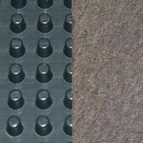 Consists of a impermeable polypropylene sheet cuspated under heat and pressure to form a high flow dimpled drainage core. The core is then bonded to a layer of nonwoven filter fabric. The filter fabric retains soil or sand particles as well as freshly placed concrete or grout, allowing filtered water to pass into the drainage core.