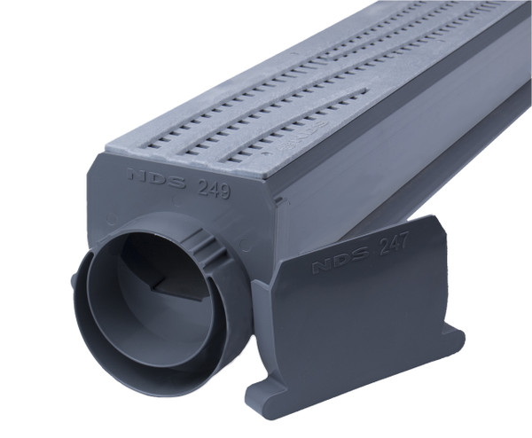 Kits includes: NDS Spee-D Channel 4" (400), 2 NDS Spee-D Channel Gray Wave Plastic Grates (253GY), NDS Coupling (248), NDS Spee-D Channel End Outlet (249) and NDS Spee-D Channel End Cap (247)
