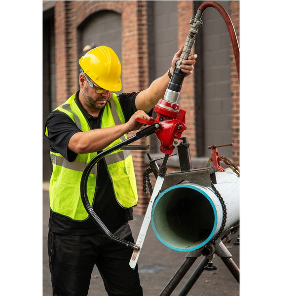 The Saw It® must have a means to hold it in place and the recommended Saw It® Vise (sold separately) provides stability and safety for the cut. Optional Blade Guides provide directional guidance for the saw. Maximum capacity is blade and blade guide dependent. Saw It® pneumatic reciprocating saw cuts up to 24” diameter pipe when used with the Saw It® Vise and a 12” chain extension. Saw It® cuts up to 20” (500 mm) diameter pipe when used with recommended SAWITBG30 blade guide. Pneumatic saws are less likely to ignite materials than gas-powered saws and even some electrical-powered saws. However, the Saw It® is not recommended for gas lines.
